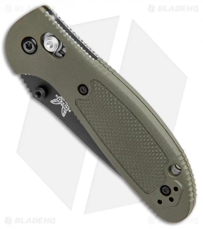 The Mini Griptilian features strong and lightweight OD green handle scales with textured surfaces for grip. The double 420J stainless liners add strength to the knife handle. The tanto blade is 154-CM stainless steel with a BK1 black finish, a partially serrated cutting edge and ambidextrous thumb studs. The pocket clip can be reversed for right or left handed people. The AXIS lock system makes the knife easy to open and close, it operates identically for right and left handers.