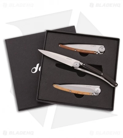 The Deejo 27 gram 3-piece wood boxed set, each with satin blade and a Grenadilla, Juniper and Rosewood handle are a lightweight, attractive addition to any collection or pocket.