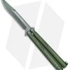 The latest generation of the Tachyon butterfly knife, the production Microtech Tachyon III, distinguishes itself from previous models with milled, single-piece channel construction handles, a spring latch, and a standard pocket clip. The blade showcases a non-sharpened swedge-ground tip and milled grooves with the Microtech logo, production date, and blade steel markings up front.