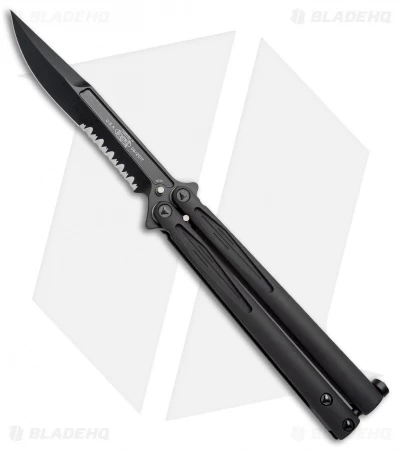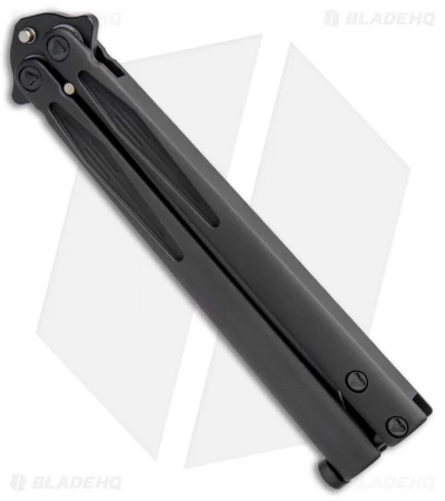 The latest generation of the Tachyon butterfly knife, the production Microtech Tachyon III, distinguishes itself from previous models with milled, single-piece channel construction handles, a spring latch, and a standard pocket clip. The blade showcases a non-sharpened swedge-ground tip and milled grooves with the Microtech logo, production date, and blade steel markings up front.