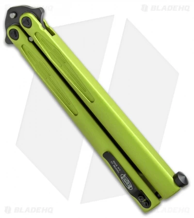 The latest generation of the Tachyon butterfly knife, the production Microtech Tachyon III, distinguishes itself from previous models with milled, single-piece channel construction handles, a spring latch, and a standard pocket clip. The blade showcases a non-sharpened swedge-ground tip and milled grooves with the Microtech logo, production date, and blade steel markings up front.