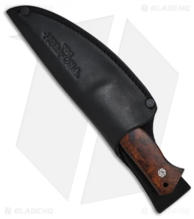The Brend Combat Companion fixed blade knife is elegant and refined. The black DLC finished full-tang blade is S35VN stainless steel with a belly and upswept tip. The handle features desert Ironwood scales that are fastened with custom screws. The handle is well-contoured with a small index choil for choking up on the blade. Includes a premium leather sheath with belt loop from GFeller Case Company.