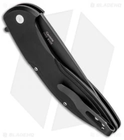 This Cambria model sports a black finished blade and a black anodized aluminum handle with a maple burl inlay and a mosaic pin button.