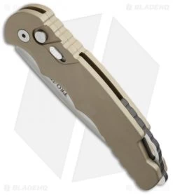 The TR-4 is a whole new take on Pro-Tech’s popular Tactical Response line. It incorporates a much requested sliding safety on the front of the handle. This TR-4 features a 4″ stonewash finished CPM-D2 steel blade with a plain edge. The ergonomic handle is desert tan anodized T6 aluminum. The TR-4 is a knife that will not let you down. It fires hard, locks up like a rock (what else would you expect from Pro-Tech?) and feel great. The TR-4 has a pocket clip (tip up) on the back of the knife for easy carry.