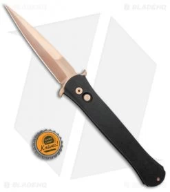 This Large Don knife is outfitted with a large rose gold finished 154-CM blade. The body is made with a black aluminum handle with a rose gold pivot and firing button. The hardware on this knife is black finished. This knife is incredibly light despite it length.