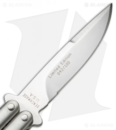 The Benchmade model 35 offers a rare chance to own a piece of Benchmade history. It features skeletonized stainless steel handles and a bayonet style blade with a polished finish. A sturdy latch secures the blade in the open or locked position. Includes a nylon belt sheath.